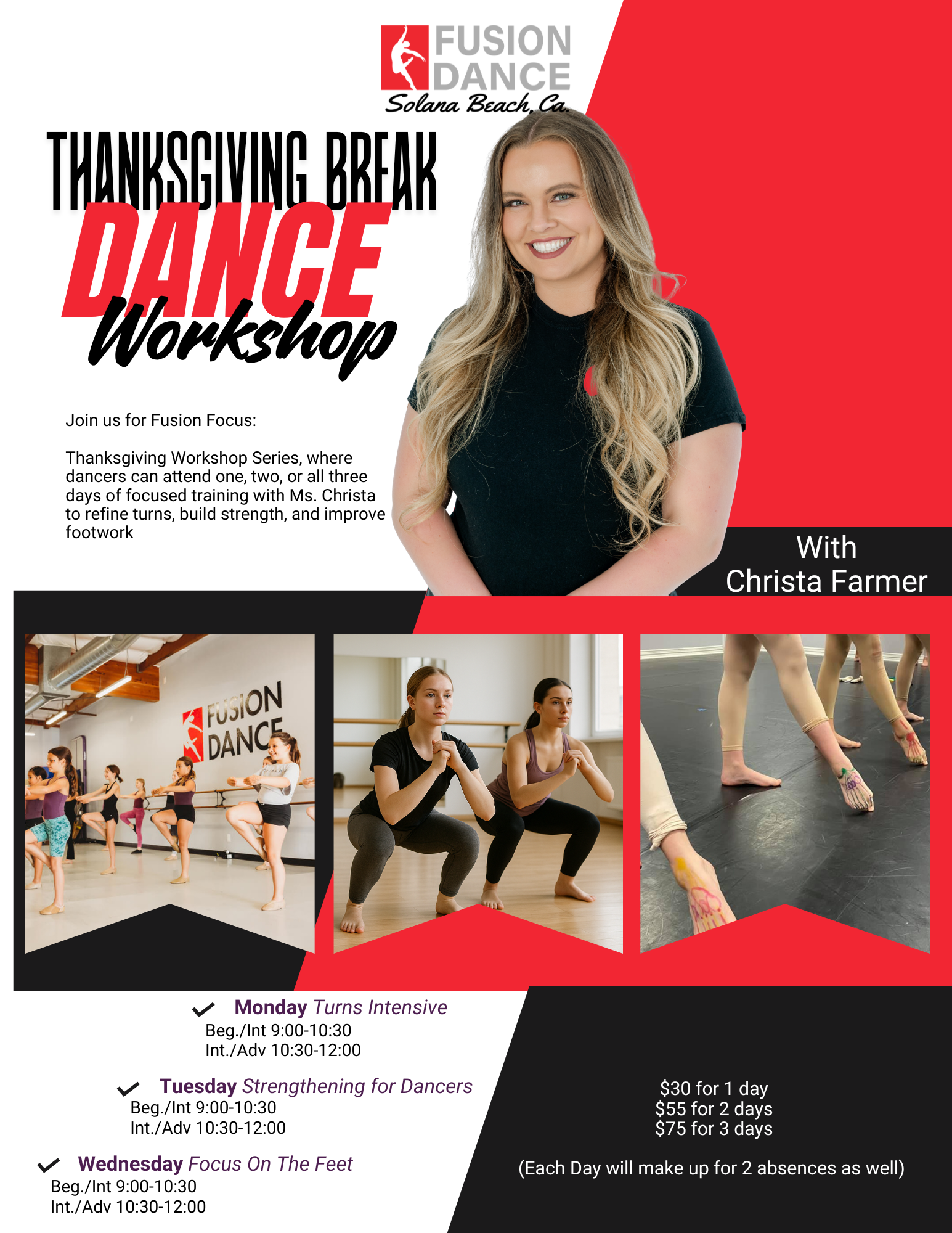 Thanksgiving Workshop Series, where dancers can attend one, two, or all three days of focused training with Ms. Christa to refine turns, build strength, and improve footwork