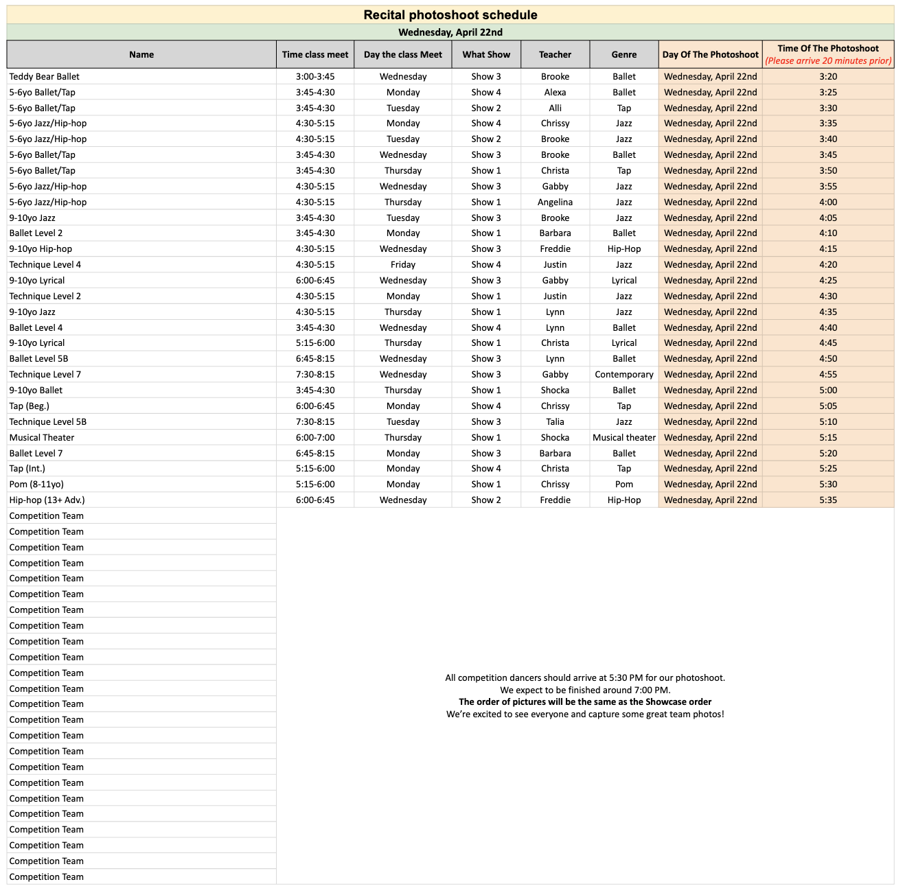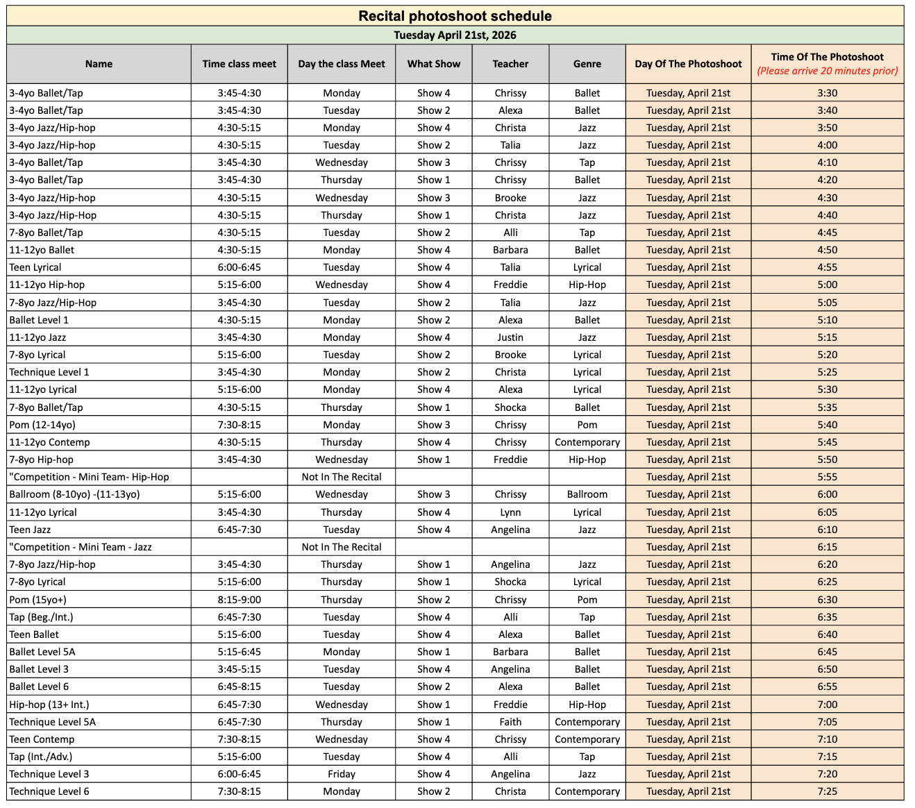 Recital Photoshoot Schedule